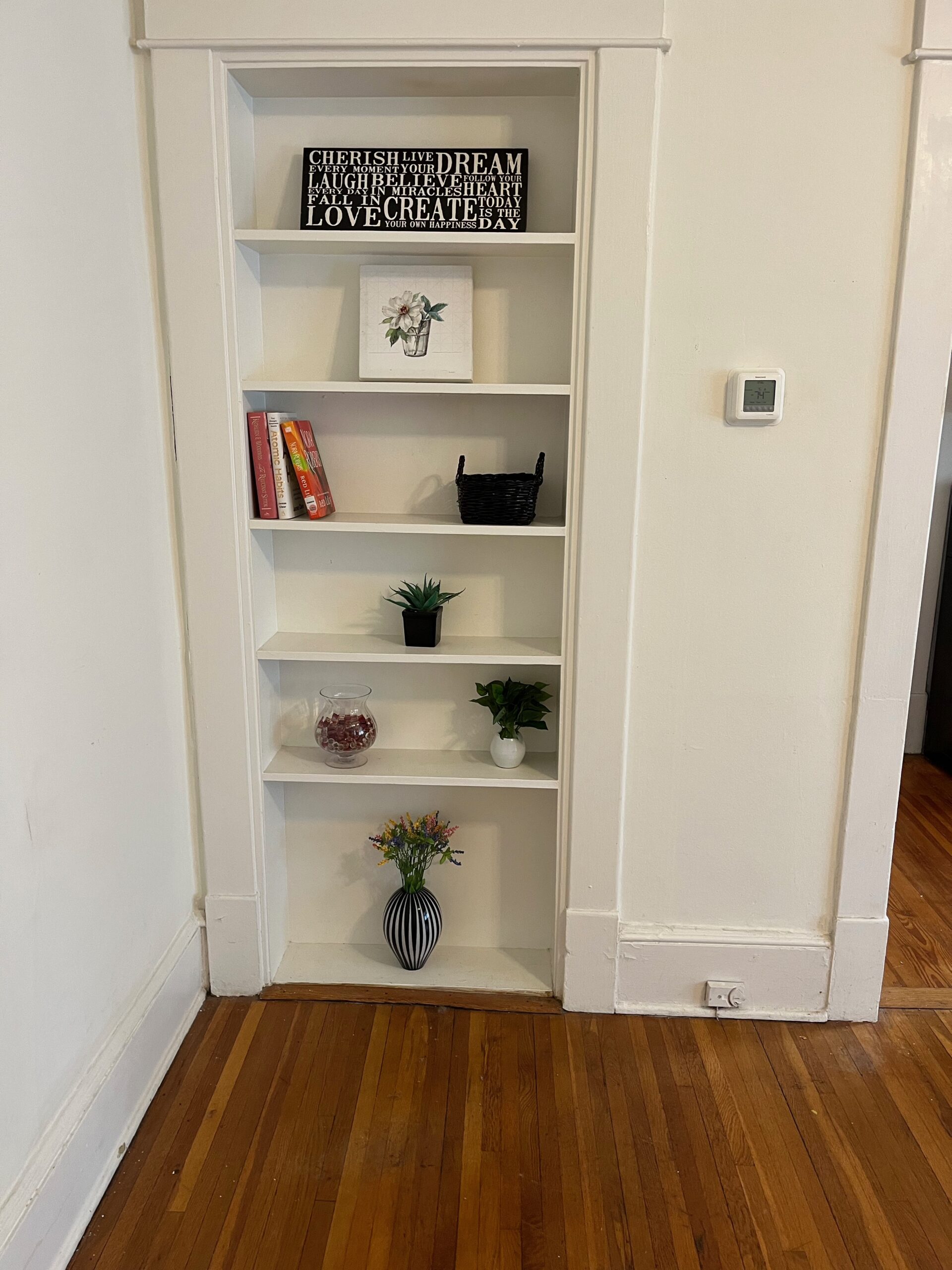 • Open Living room with built in book shelves, small Dining area or use as home office, high ceiling’s. updated ceiling fan/light, wide molding, wood floors