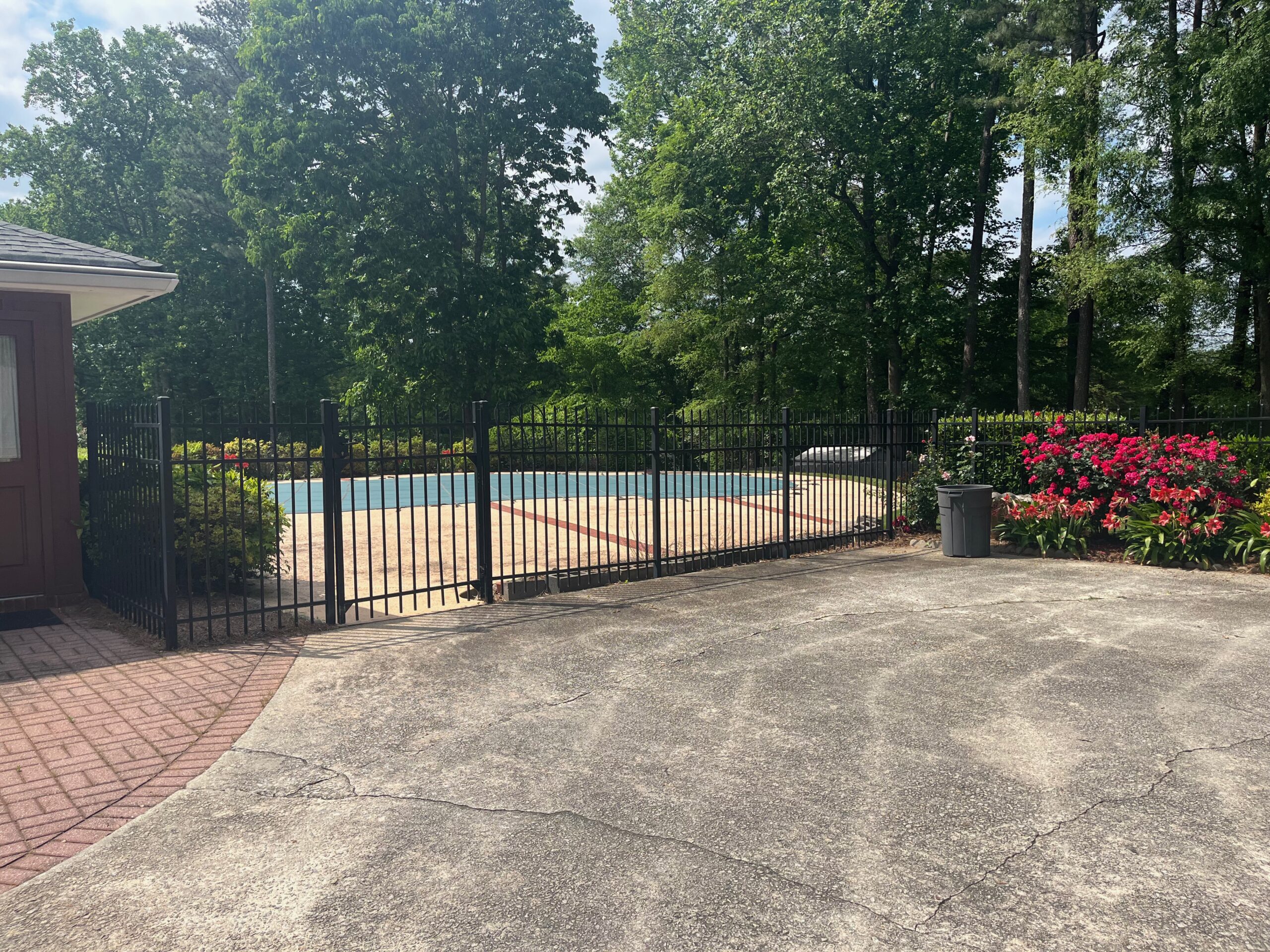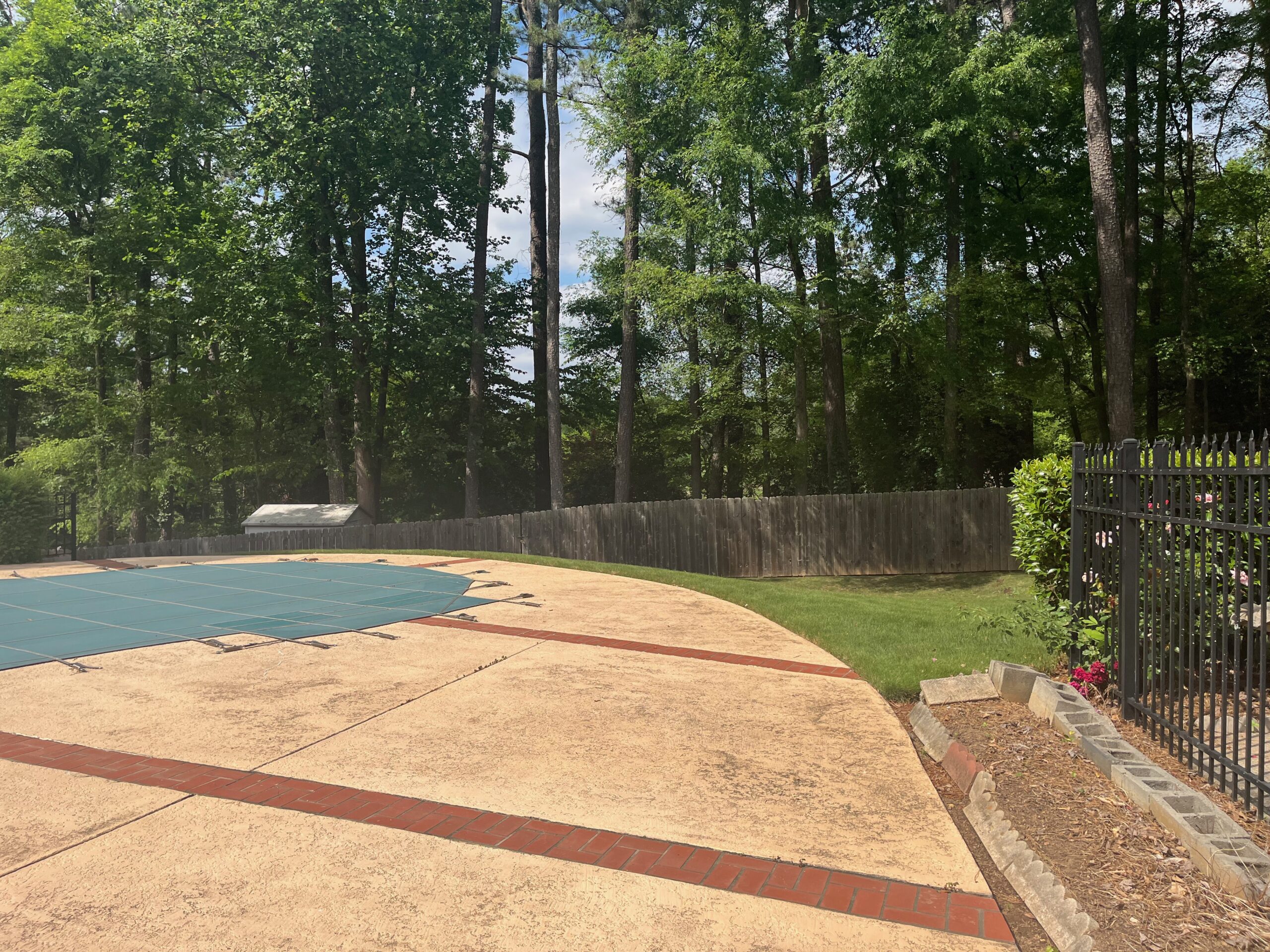 - Covered carport, small storage room with washer and dryer, large fenced in yard, built in pool, small storage shed