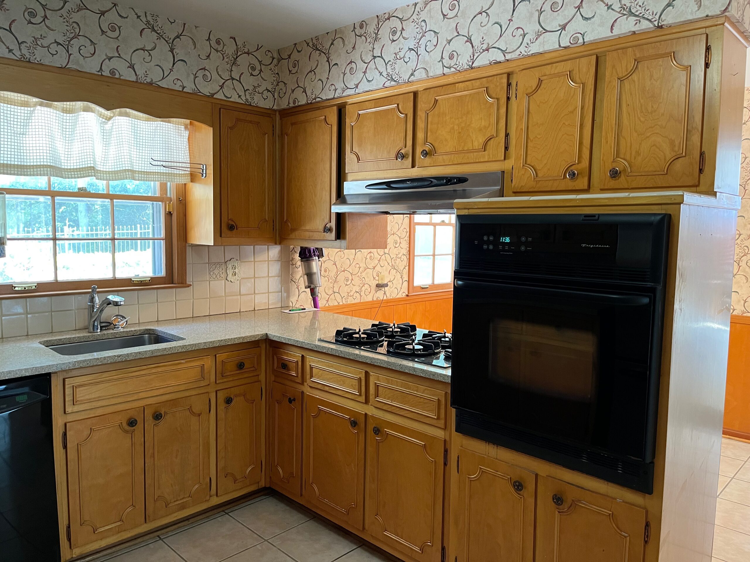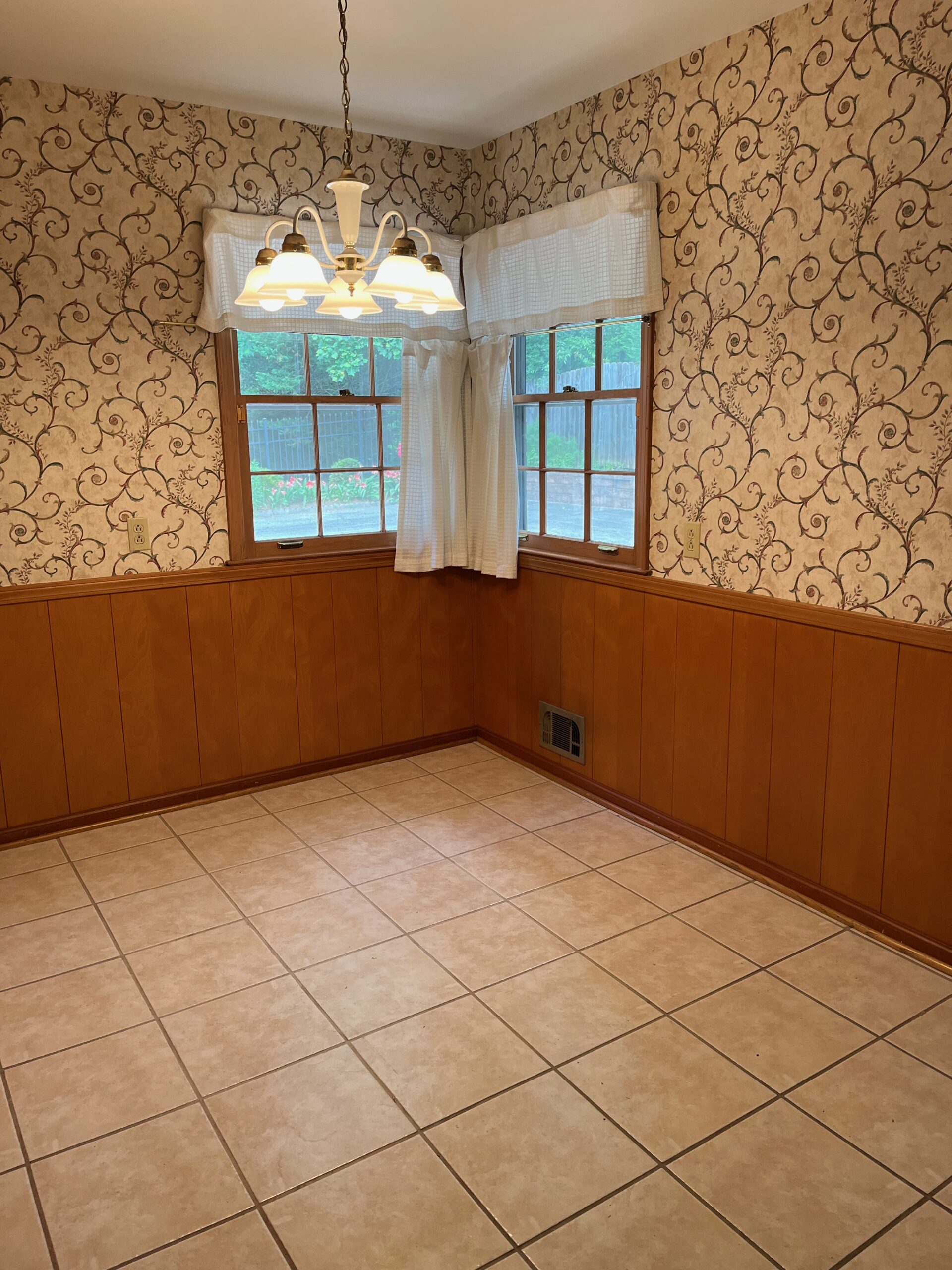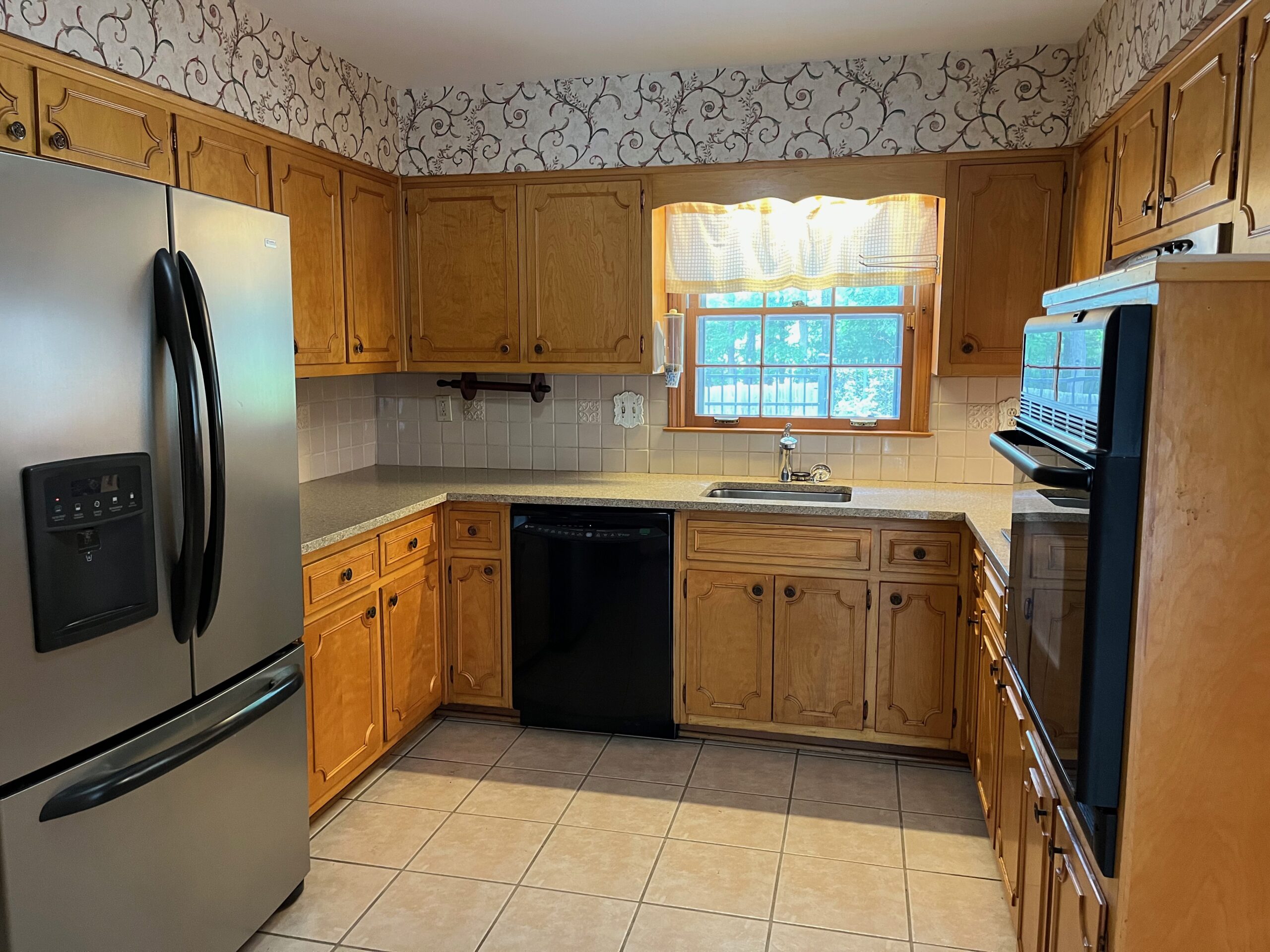 - Eat in kitchen with tile floors, plenty of wood cabinets, lots of great natural light, double panty