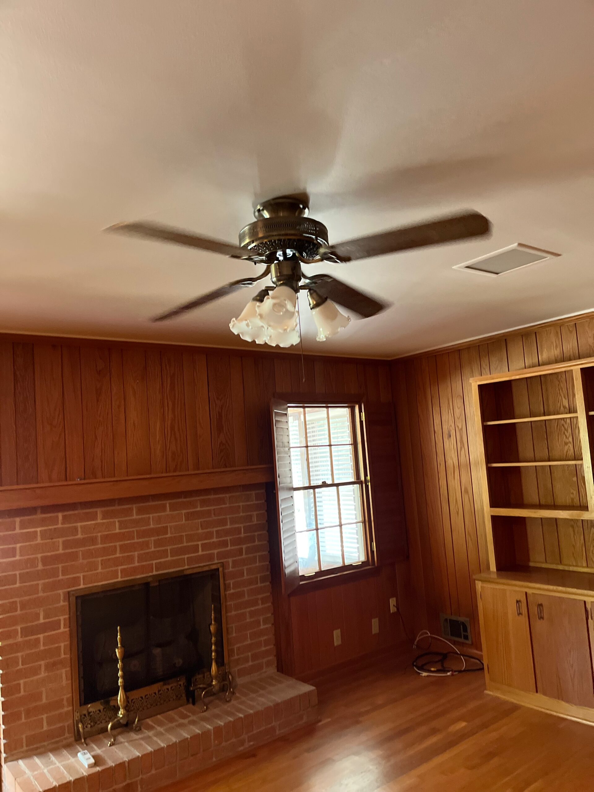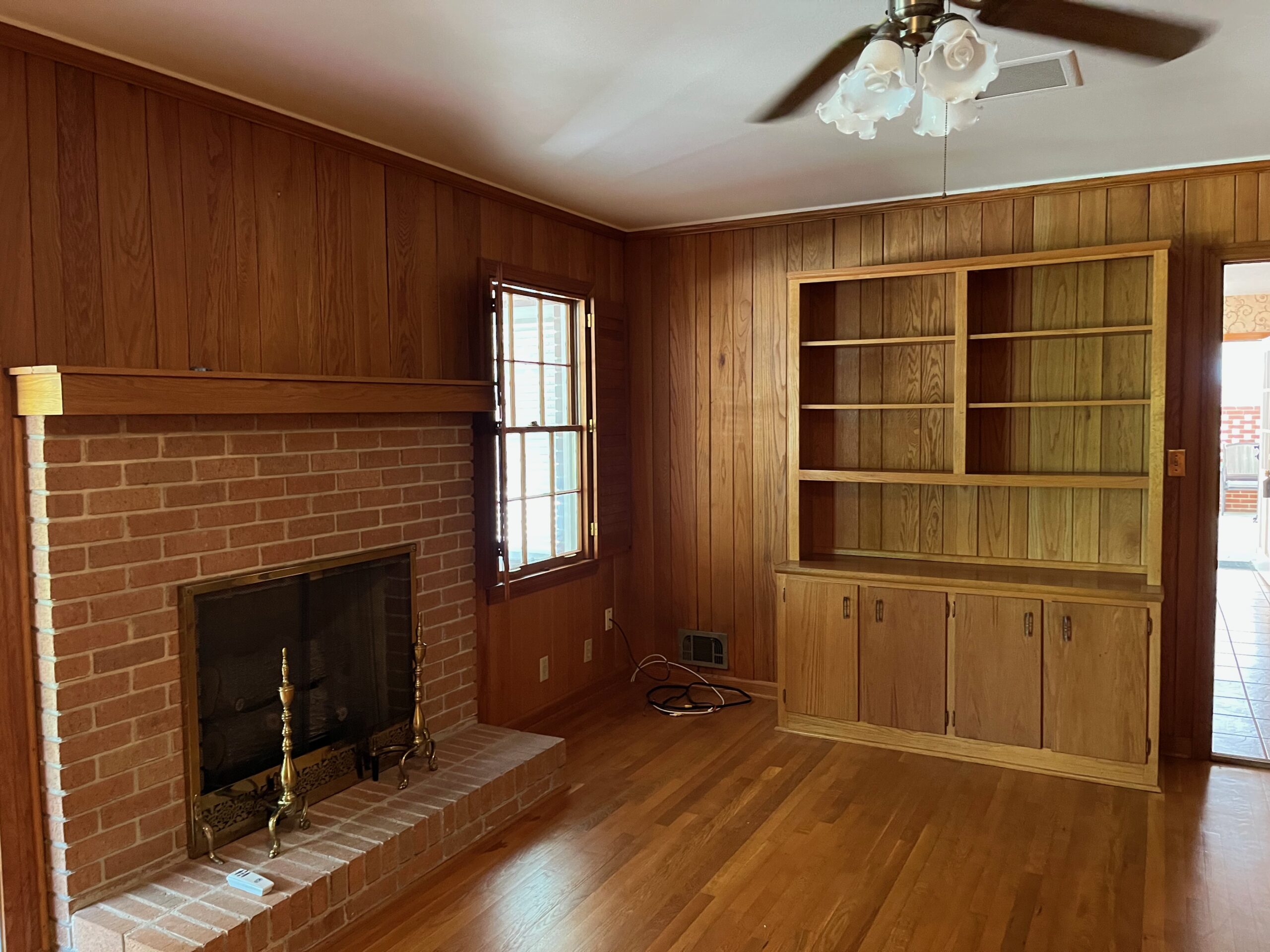 - Paneled family room, wood floors, wood burning fireplace and built in cabinet’s/shelves