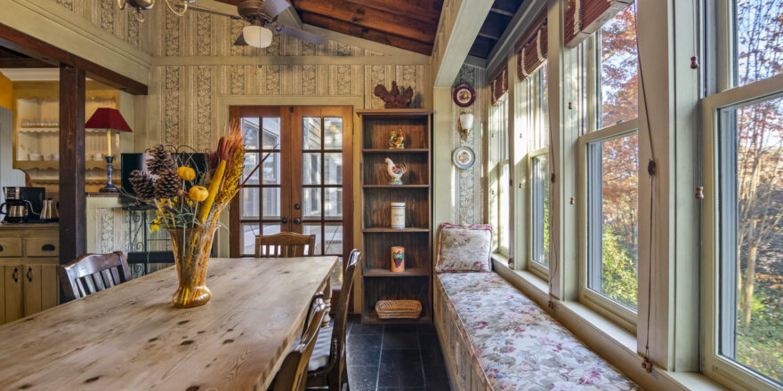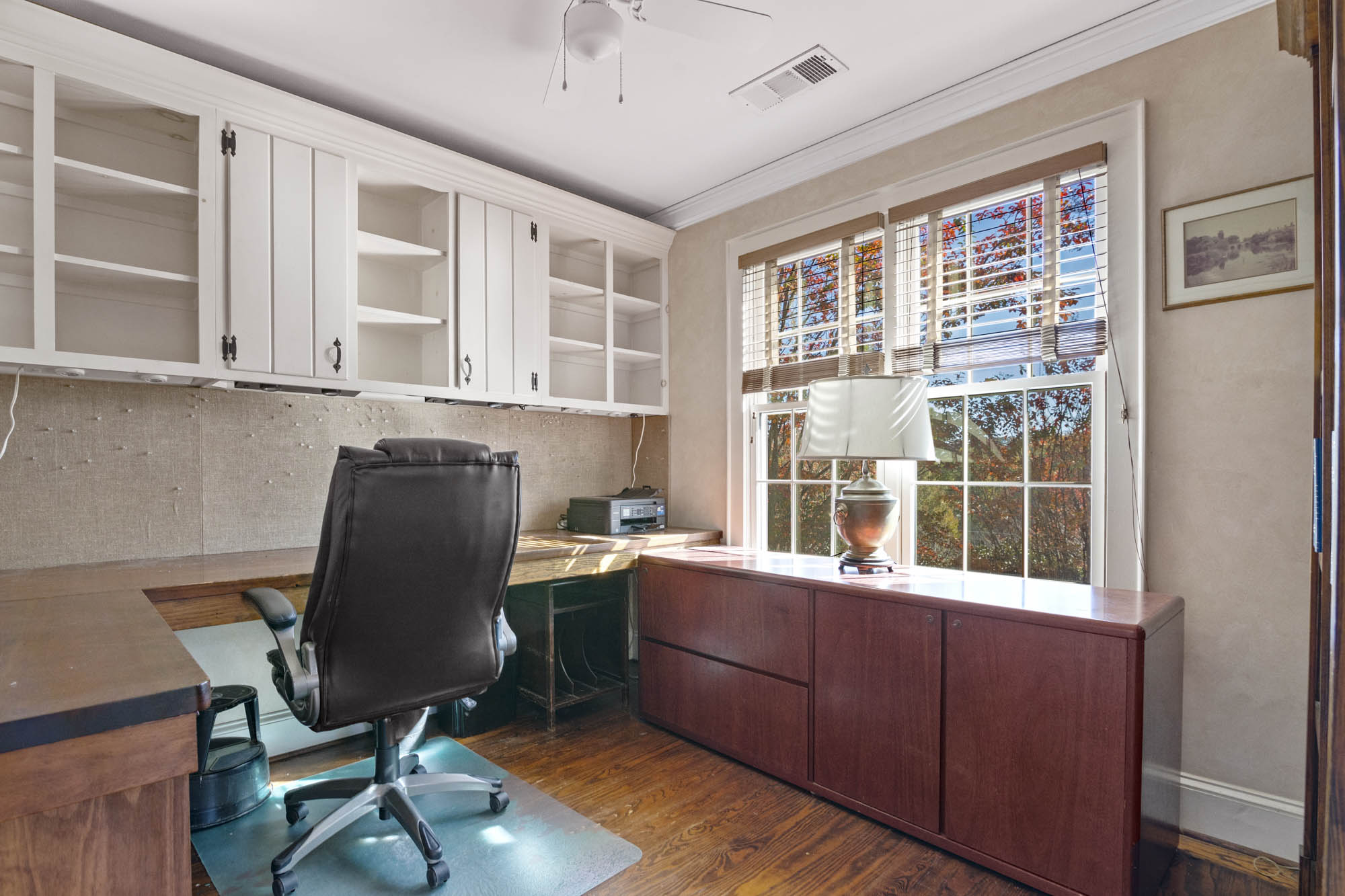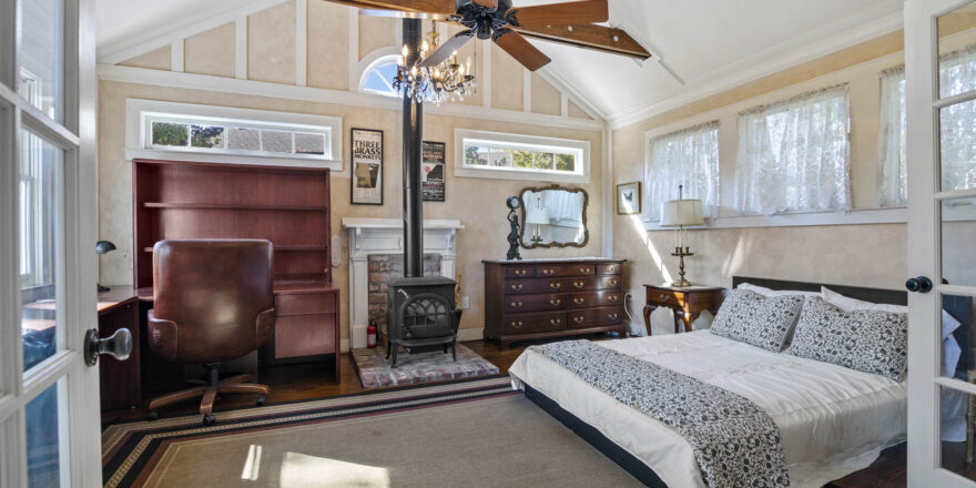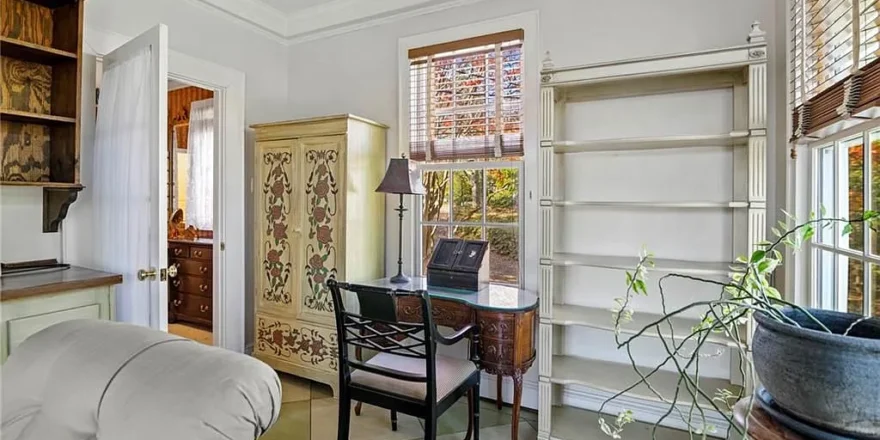 - Annex addition features a full bathroom, small area for office, separate office with shelves, full bedroom with new curtains, blinds, wood burning fireplace, wood floors, plenty of natural light
