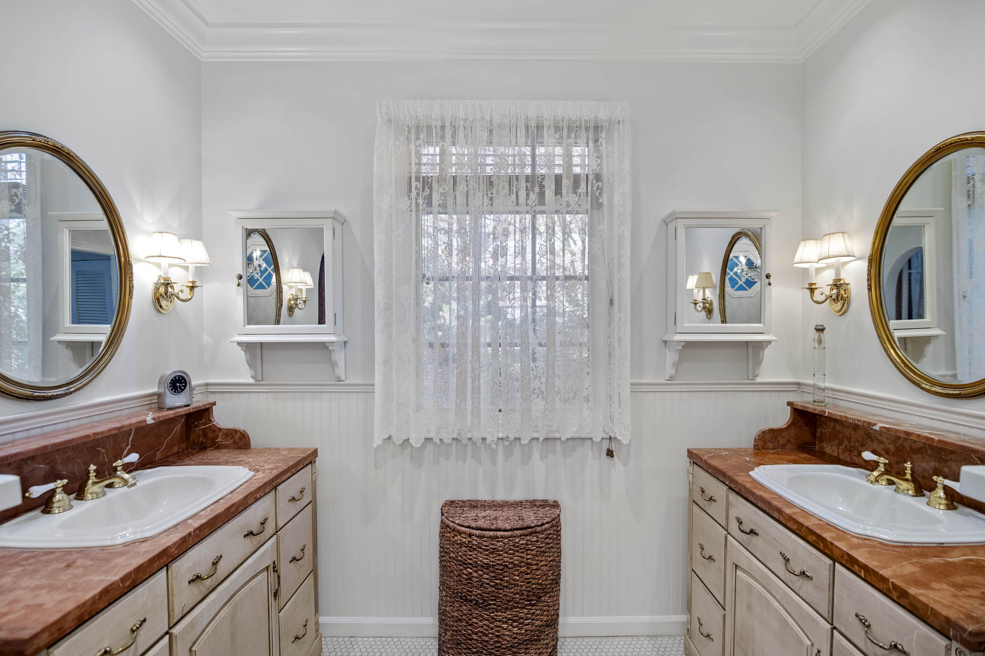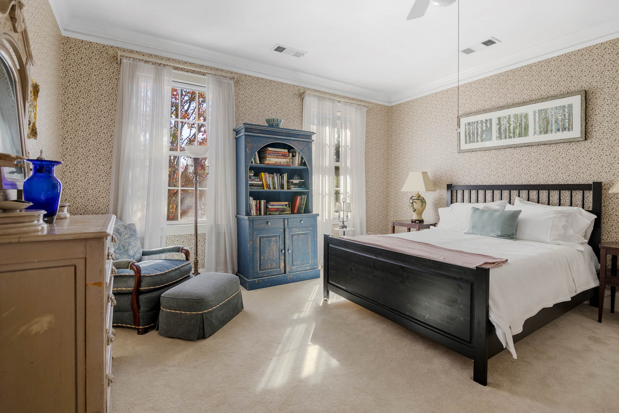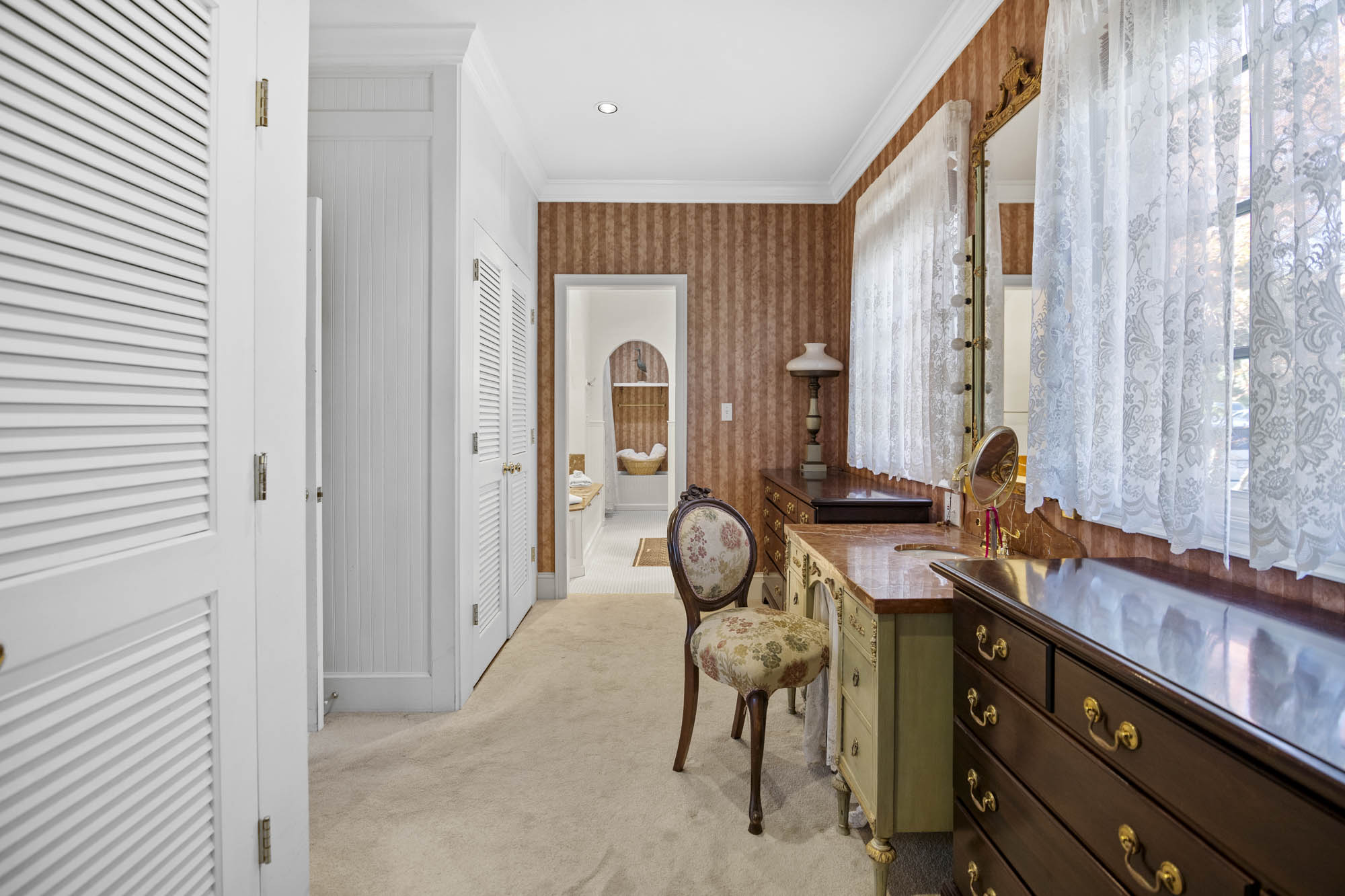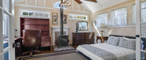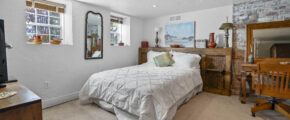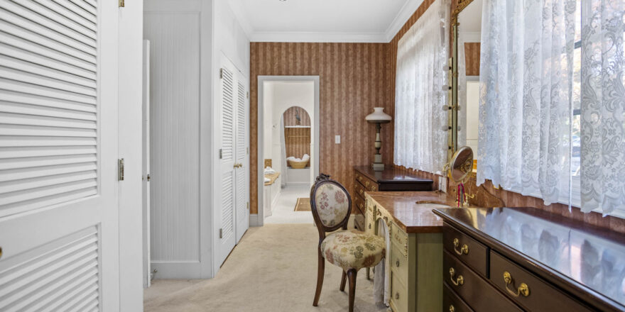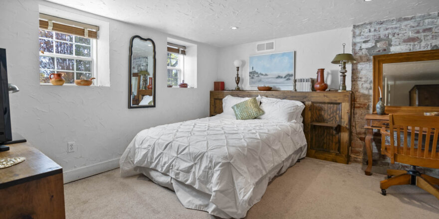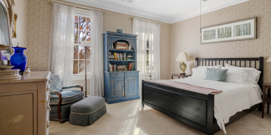 - 4 Bedrooms, one primary with private sitting area, off bedroom, fireplace, large dressing area with 2 closets, small make up sink, built in dressers, and access to the private bathroom, one bedroom on finished lower level, and one across from the primary bedroom, one in “annex” part of the house