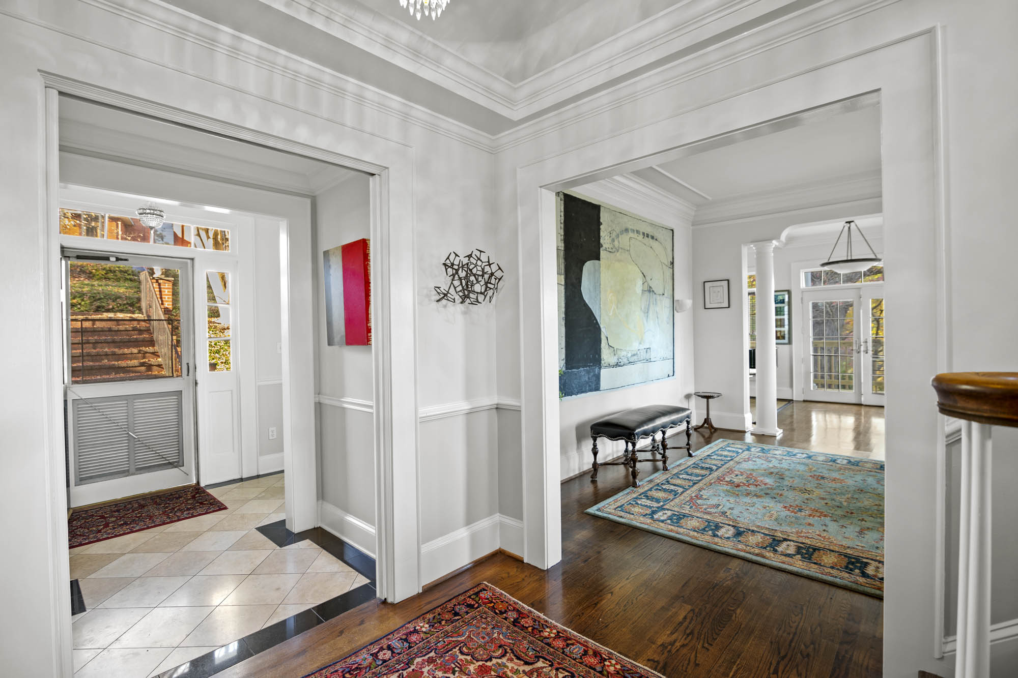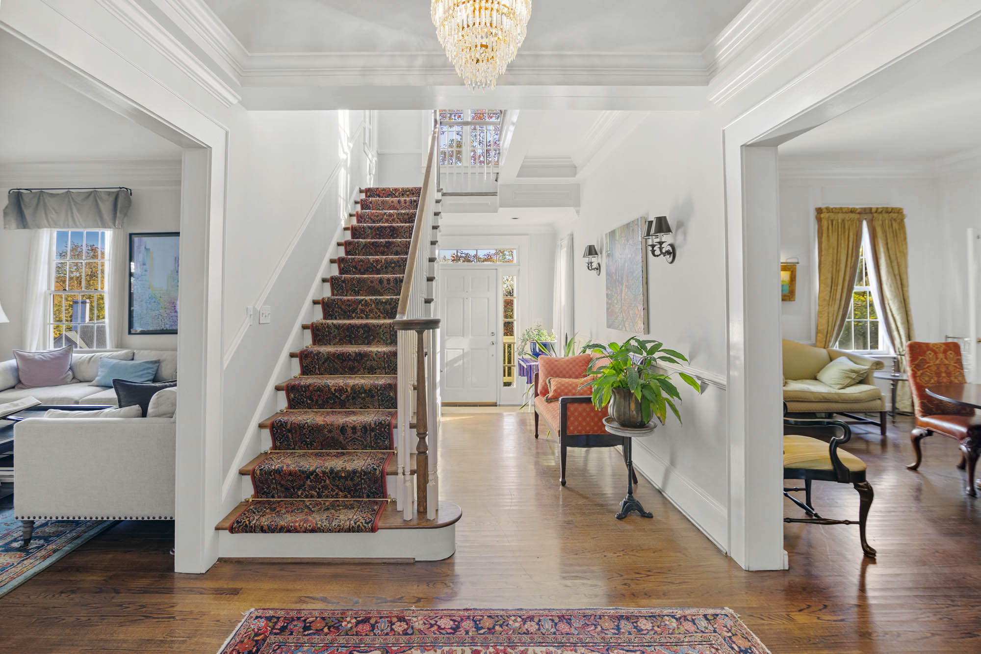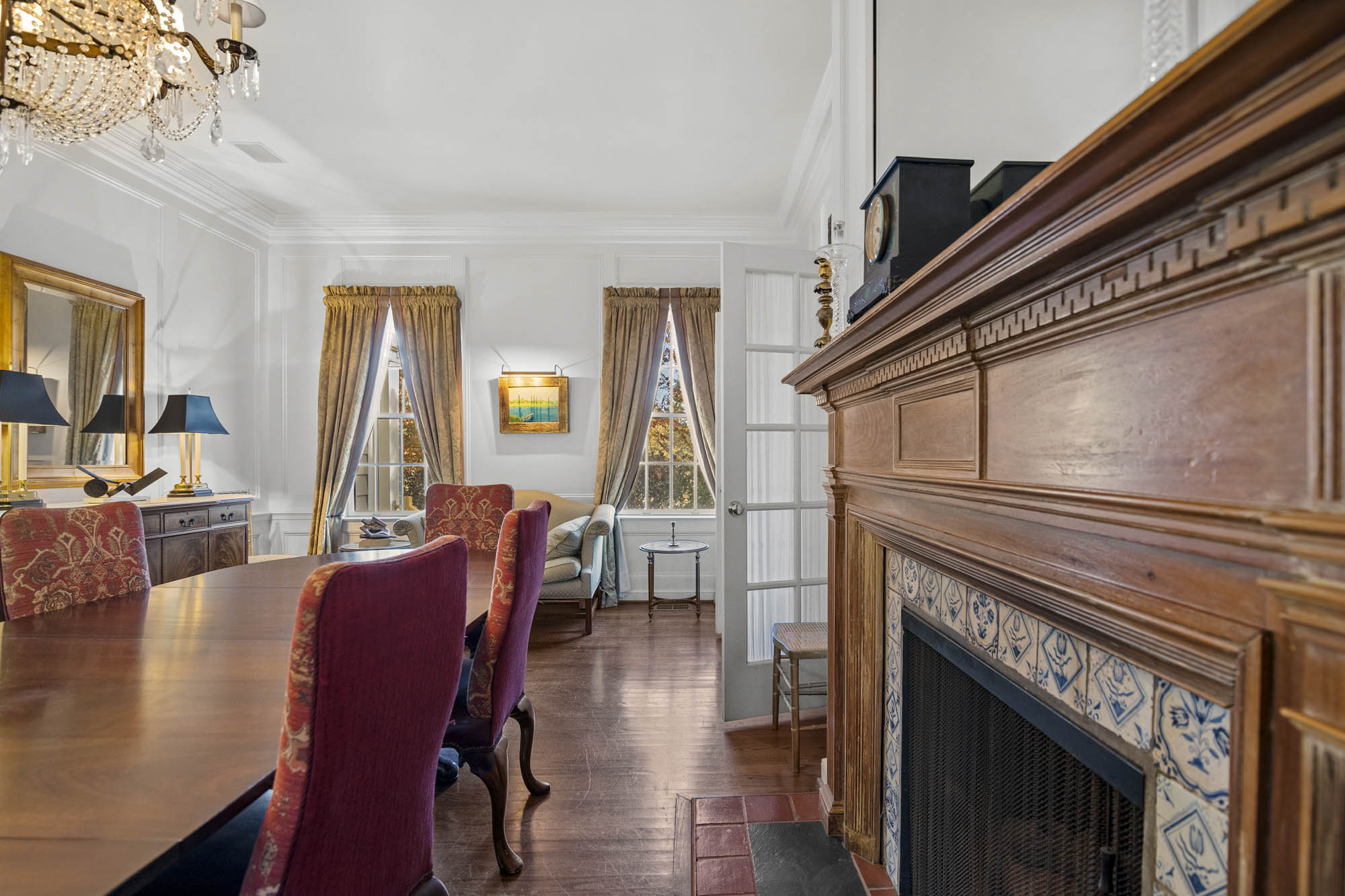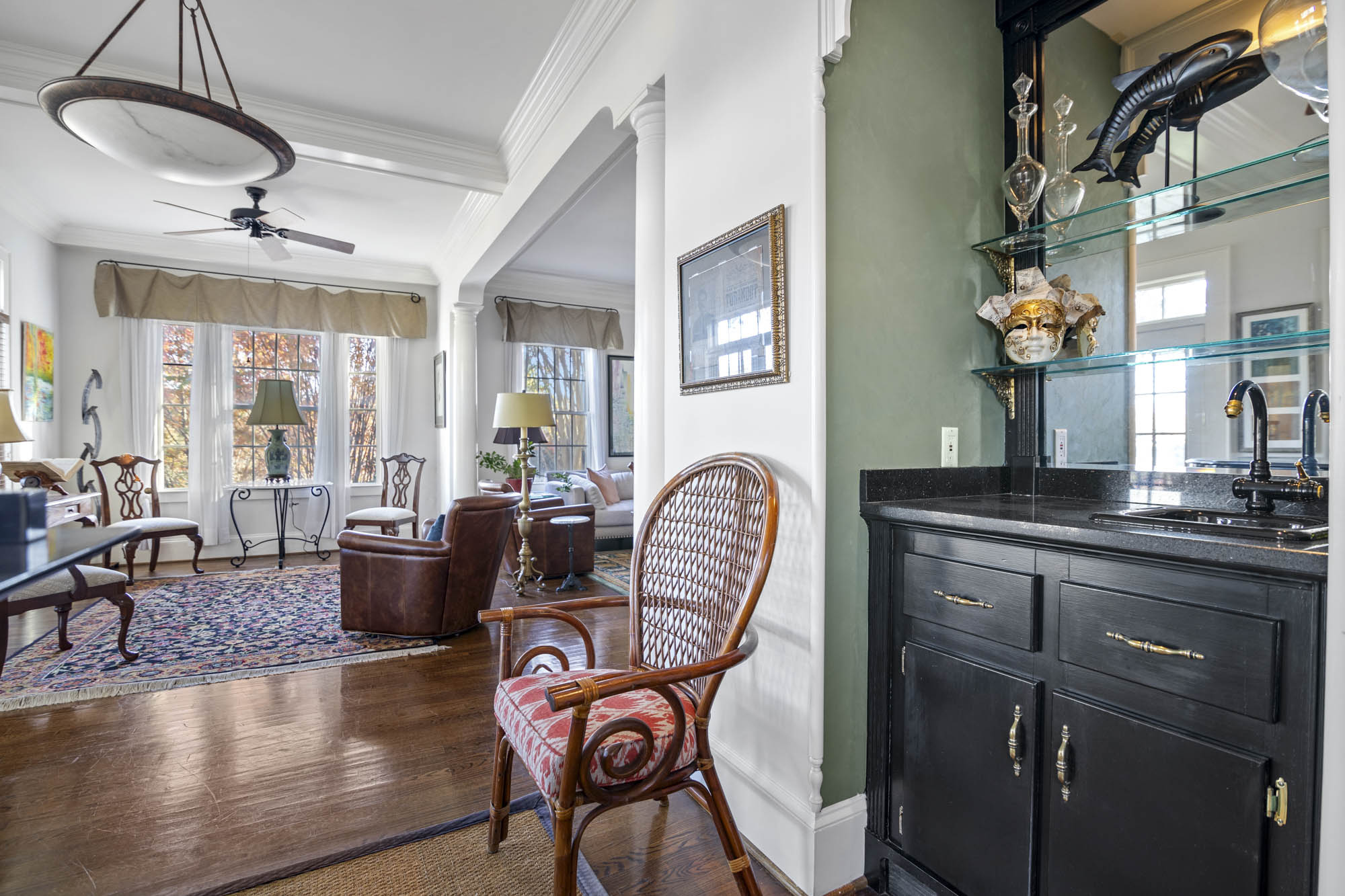 - Large entry foyer, hardwood floors, Enormous Living room, sitting/music room, lots of light through all the window’s, access to the sitting porch /deck overlooking the pool and the beautiful grounds