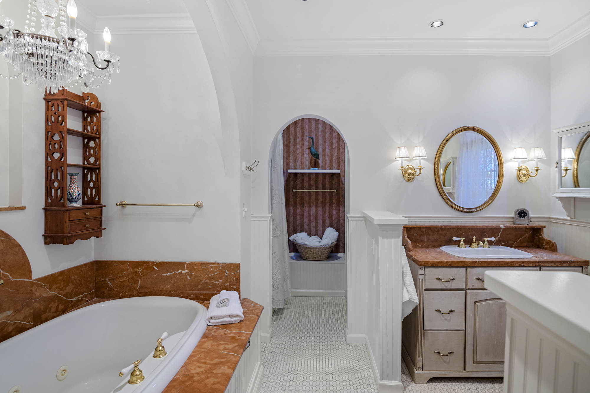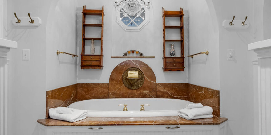 - 5 full bathrooms, 2 half baths, both on main level, two full bathrooms on the lower level, one off each bedroom, primary with two vanities, jacuzzi tub, and separate water closet