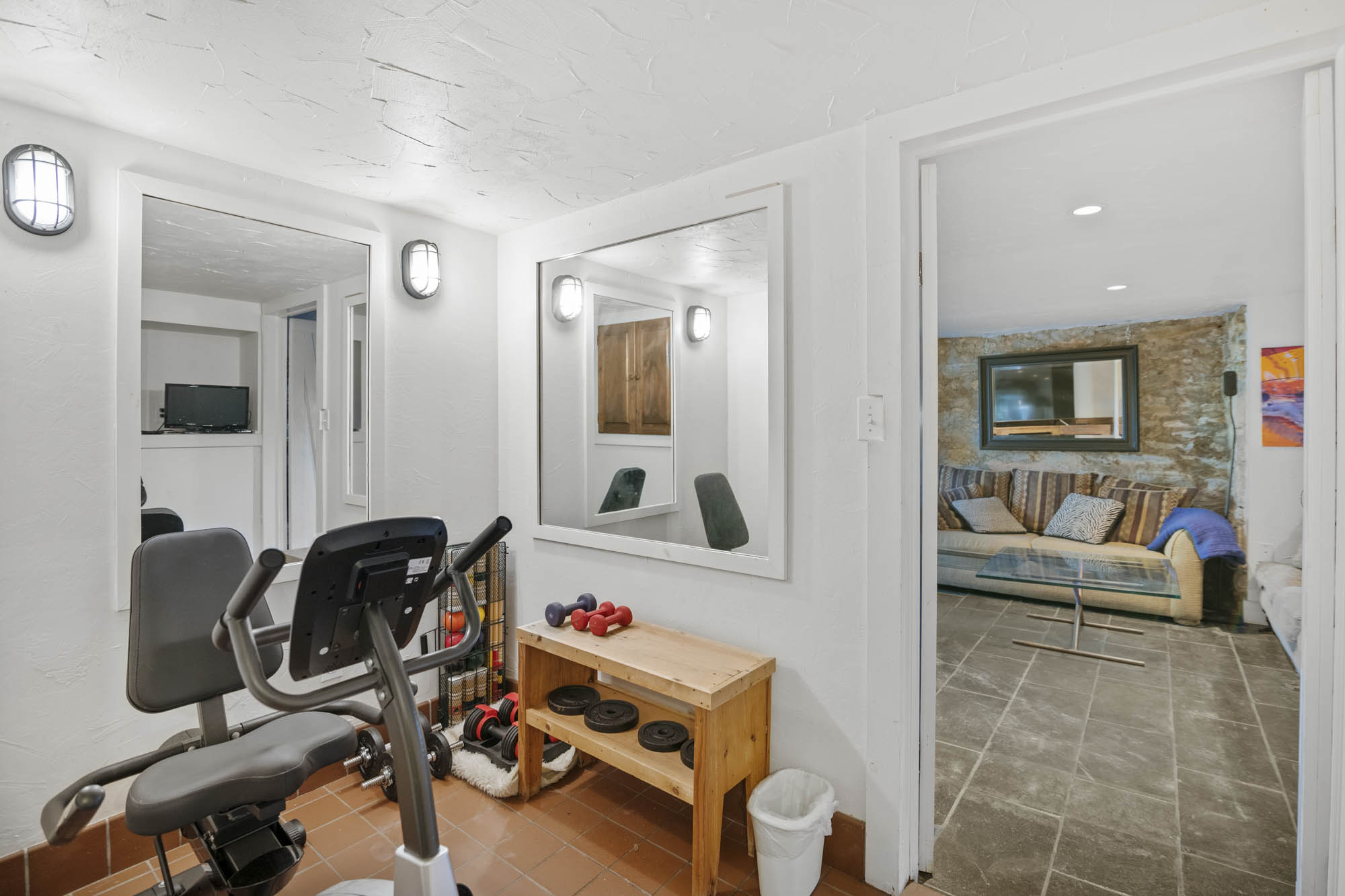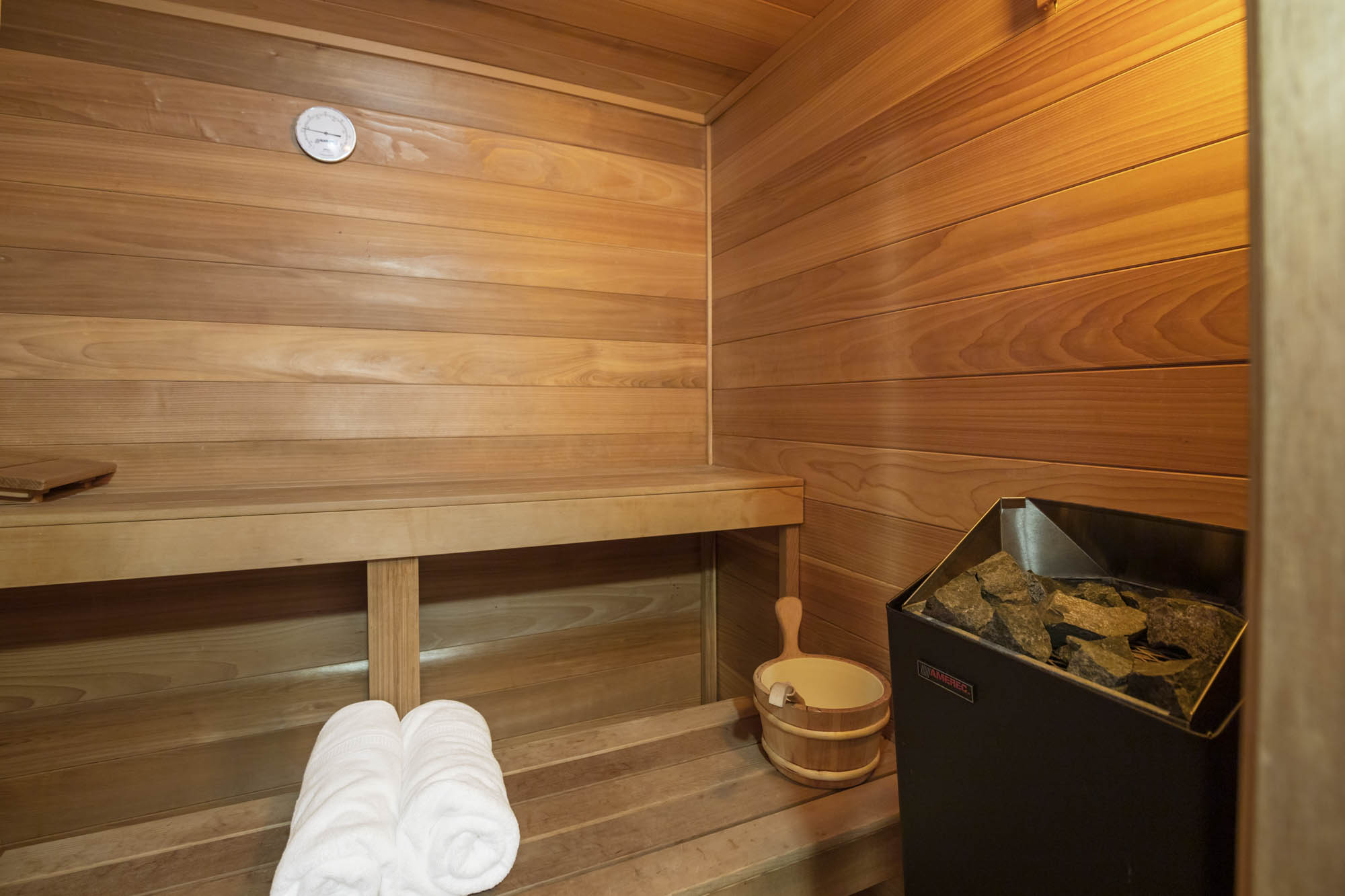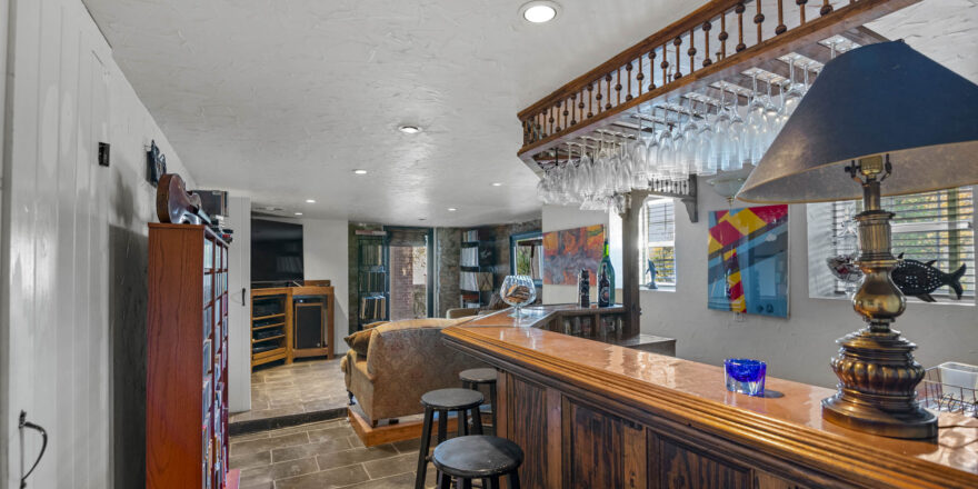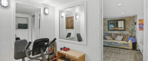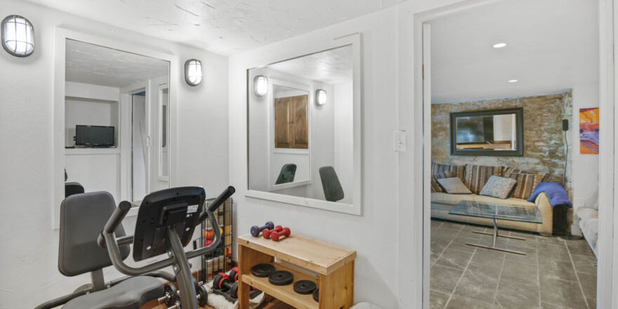 - Finished lower level with bar, den/media room, full bathroom with sauna in hall, laundry room, additional bedroom with full bathroom, lots of storage space and small exercise room