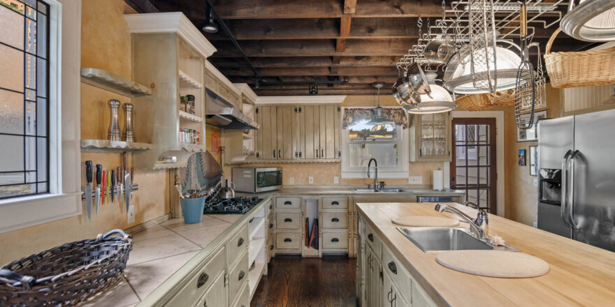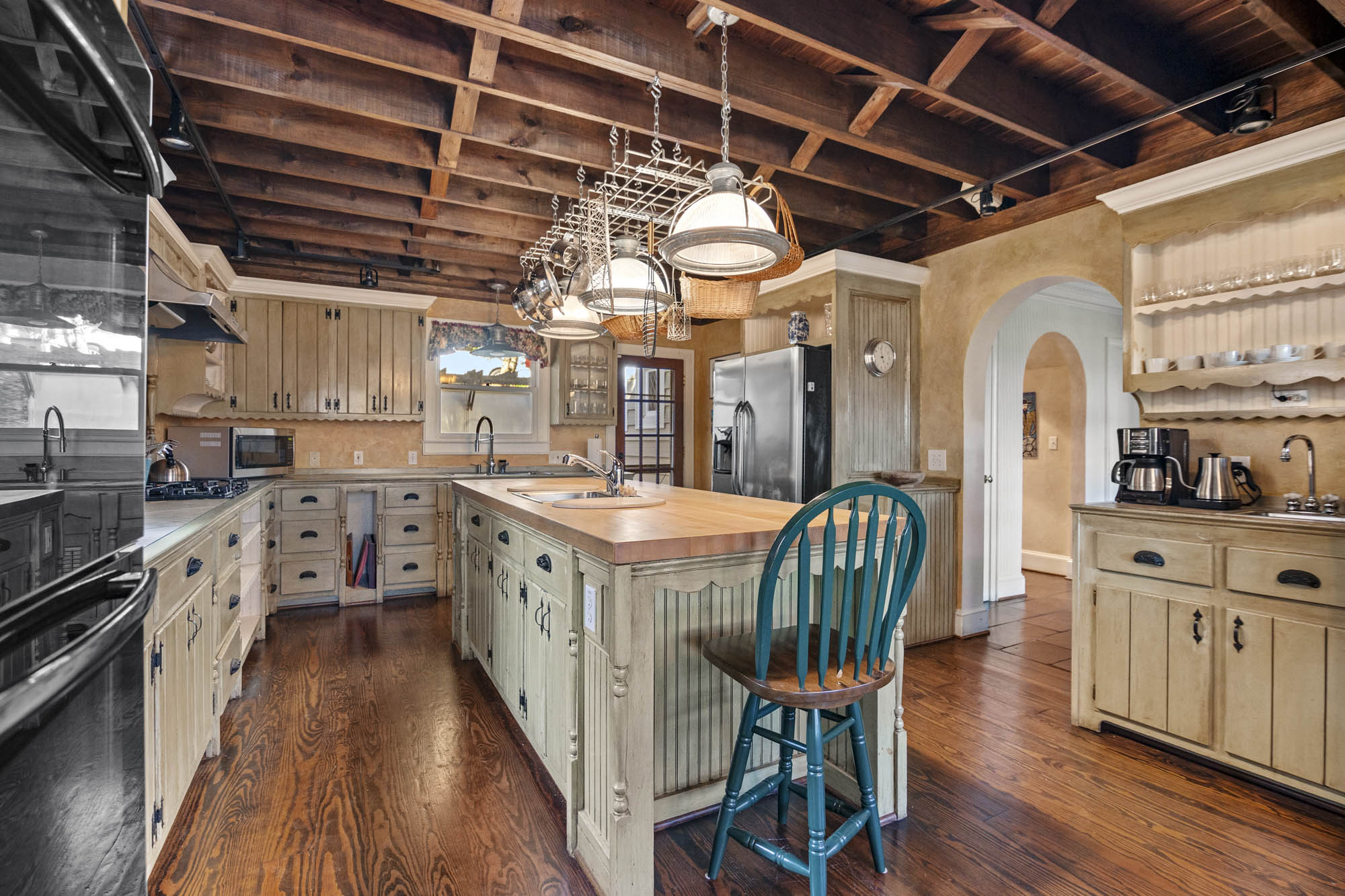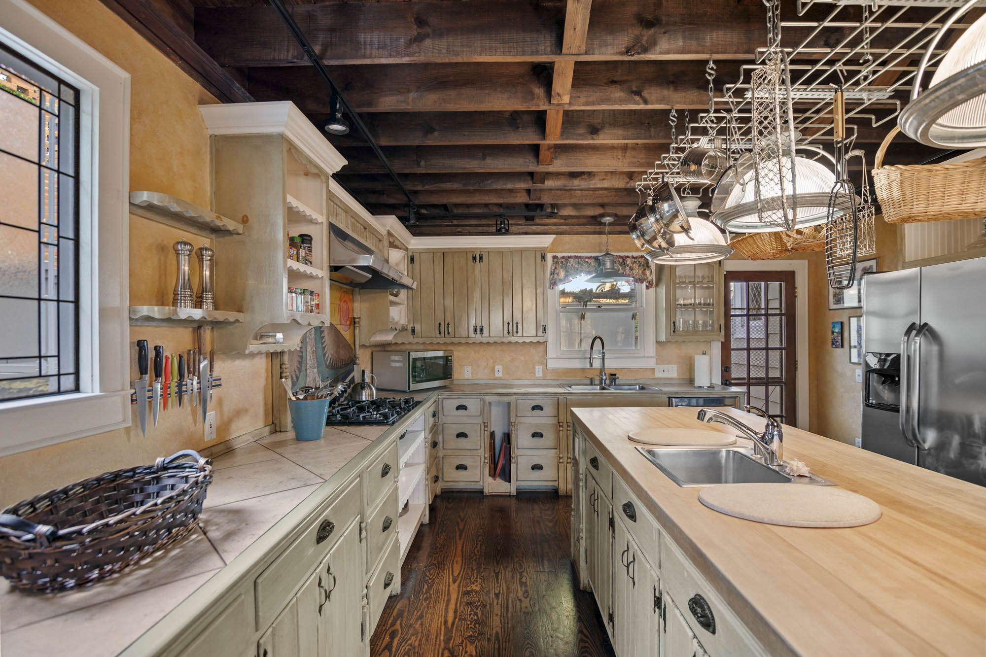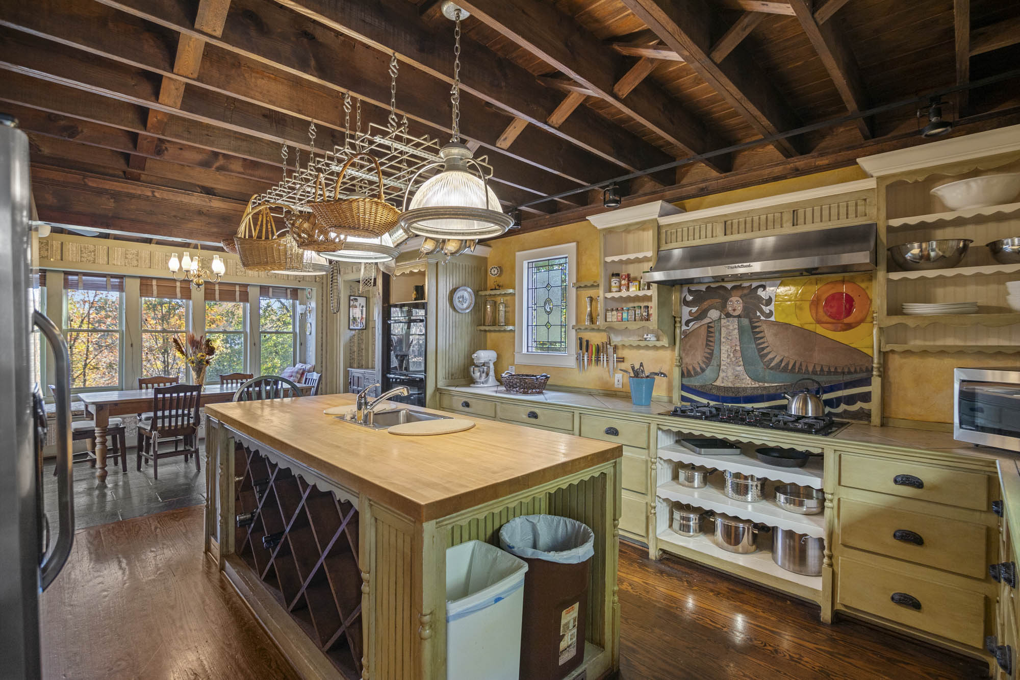 - Eat ink kitchen, high ceilings, built in pot rack, huge island, 2 sinks, vaulted exposed wood ceilings, bench seat that overlooks the yard and the greenery, stainless appliances, fully furnished