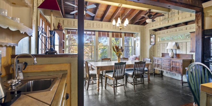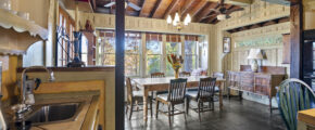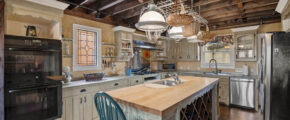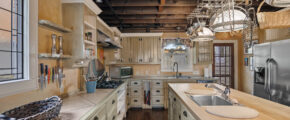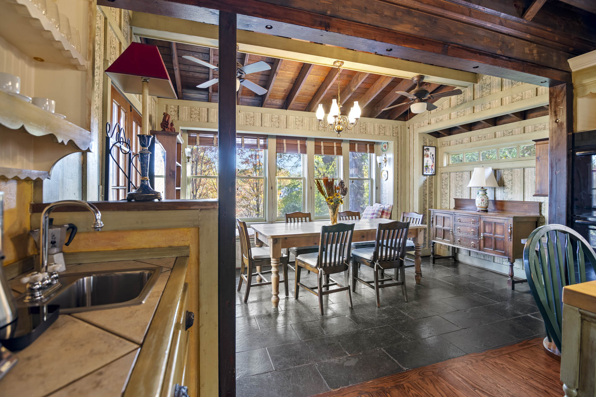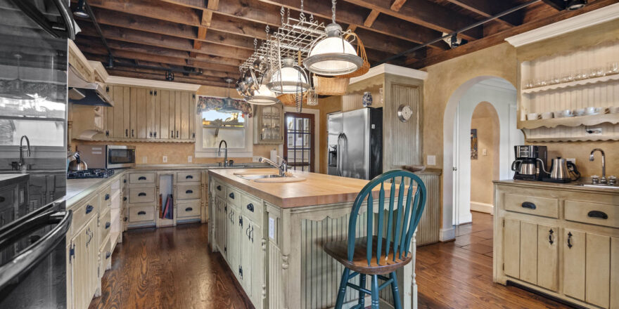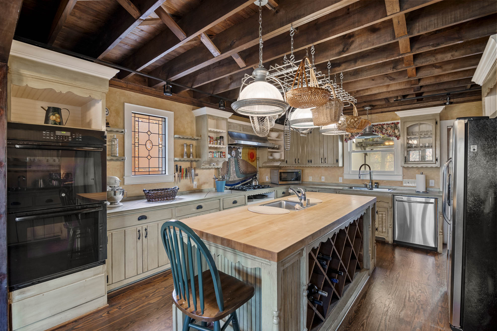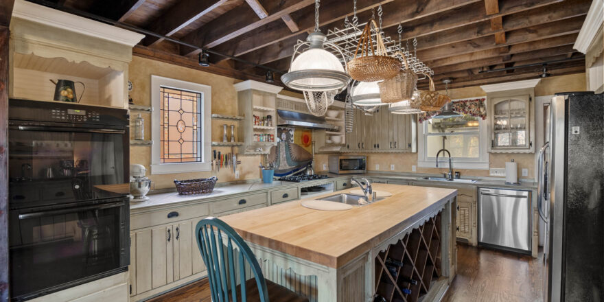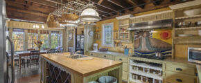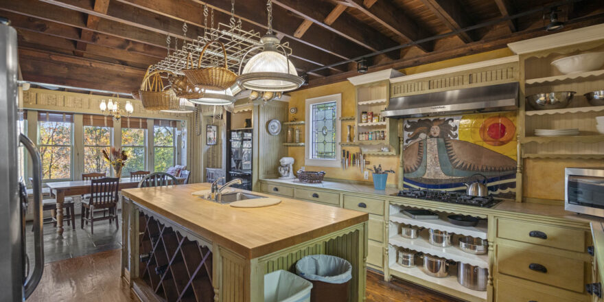 - Eat ink kitchen, high ceilings, built in pot rack, huge island, 2 sinks, vaulted exposed wood ceilings, bench seat that overlooks the yard and the greenery, stainless appliances, fully furnished